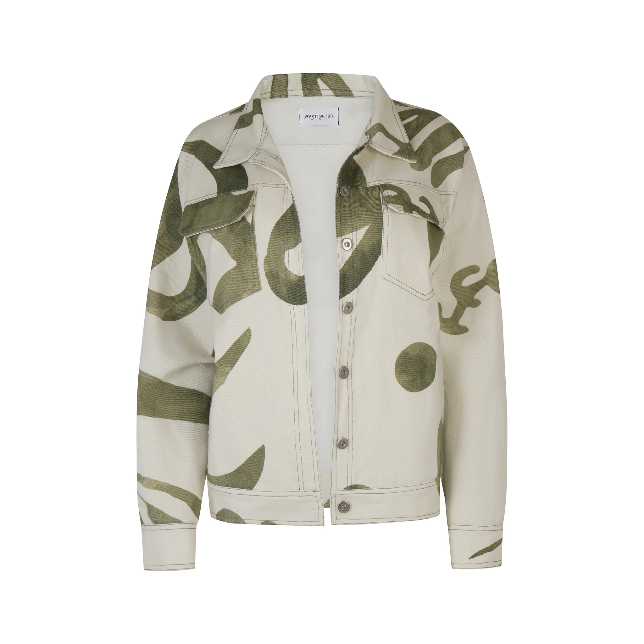 Effortlessly artistic, this abstract-print jacket is a modern wardrobe essential. Designed with a structured fit, metallic buttons, and bold nature-inspired shapes in olive green over a soft off-white base, it makes a quiet statement. Pair it with the matching pants for a standout coordinated look, or throw it over denim for elevated casual style.