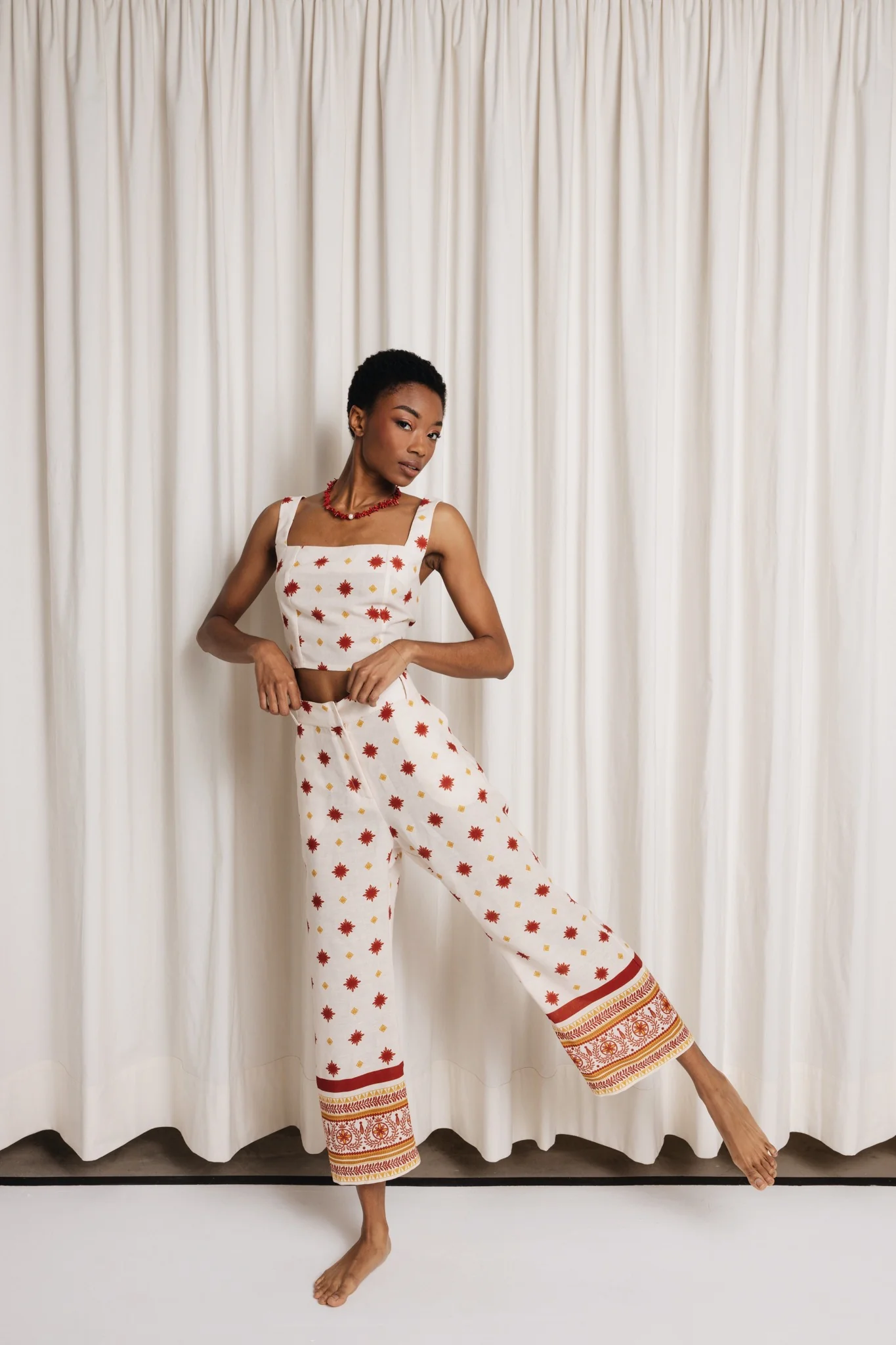 Comfort meets culture in these printed pants featuring an eye-catching ethnic border detail. The high-waisted, straight-leg fit is designed for ease and style, while the breathable fabric makes them perfect for warm-weather wear. Pair them with the matching shirt or keep it simple with a solid top.
